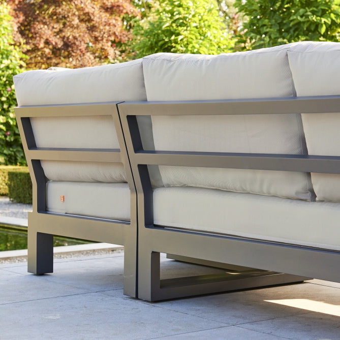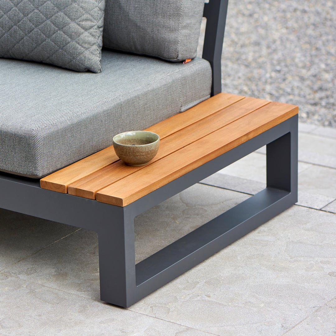 The fresh, laid-back style of the Soho Lounge Set is sure to transform your outdoor living space into a peaceful sanctuary. Share an evening of gathering and fun while relaxing in the open-ended loveseat with built in FSC certified teak end tables and ultra-comfortable all-weather cushions.