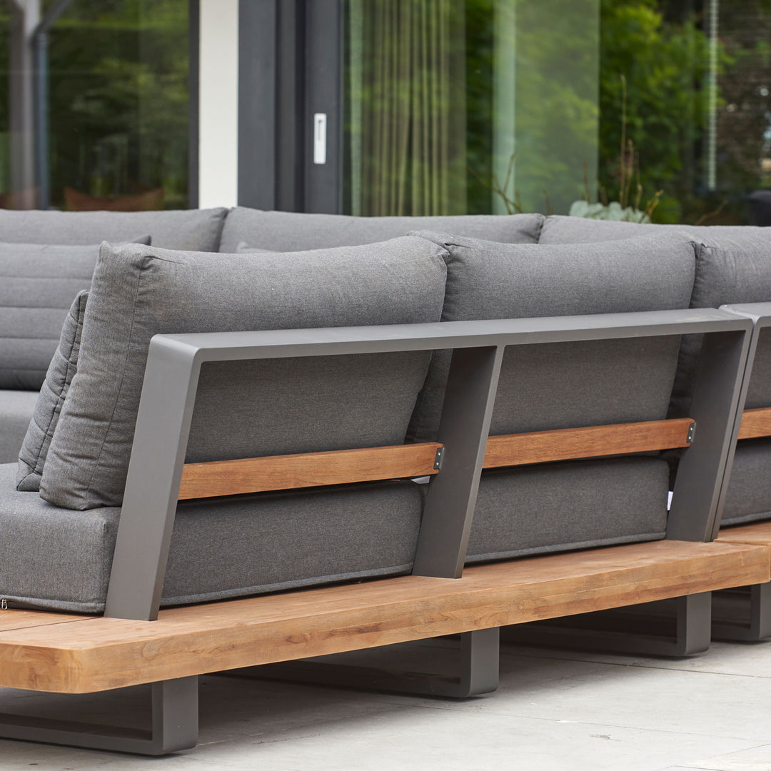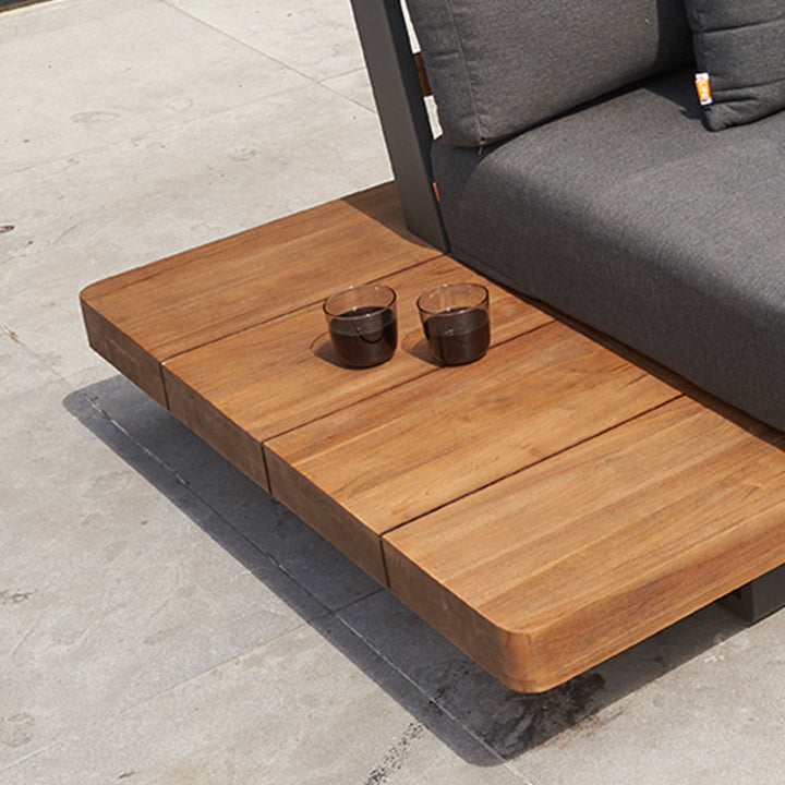 Sofas feature convenient, integrated teak side tables that make this set a statement piece.