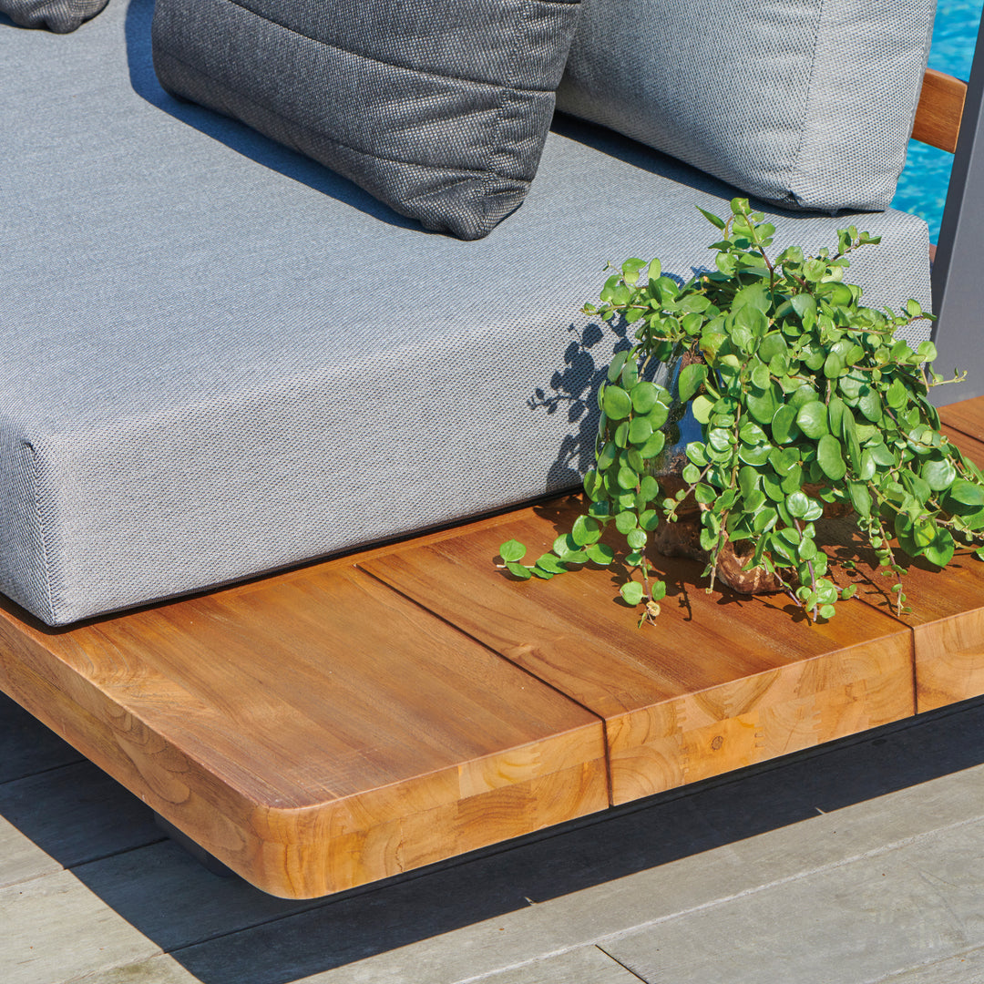 If you are searching for a statement piece that will draw everyone to your outdoor living space, then look no further. The Fitz Roy teak sofa is a beautiful warm blend of all natural Indonesian teak wood on a strong aluminum frame combined with all-weather cushions. The finesse of the calm color palette of this lounge set fits in perfectly anywhere.