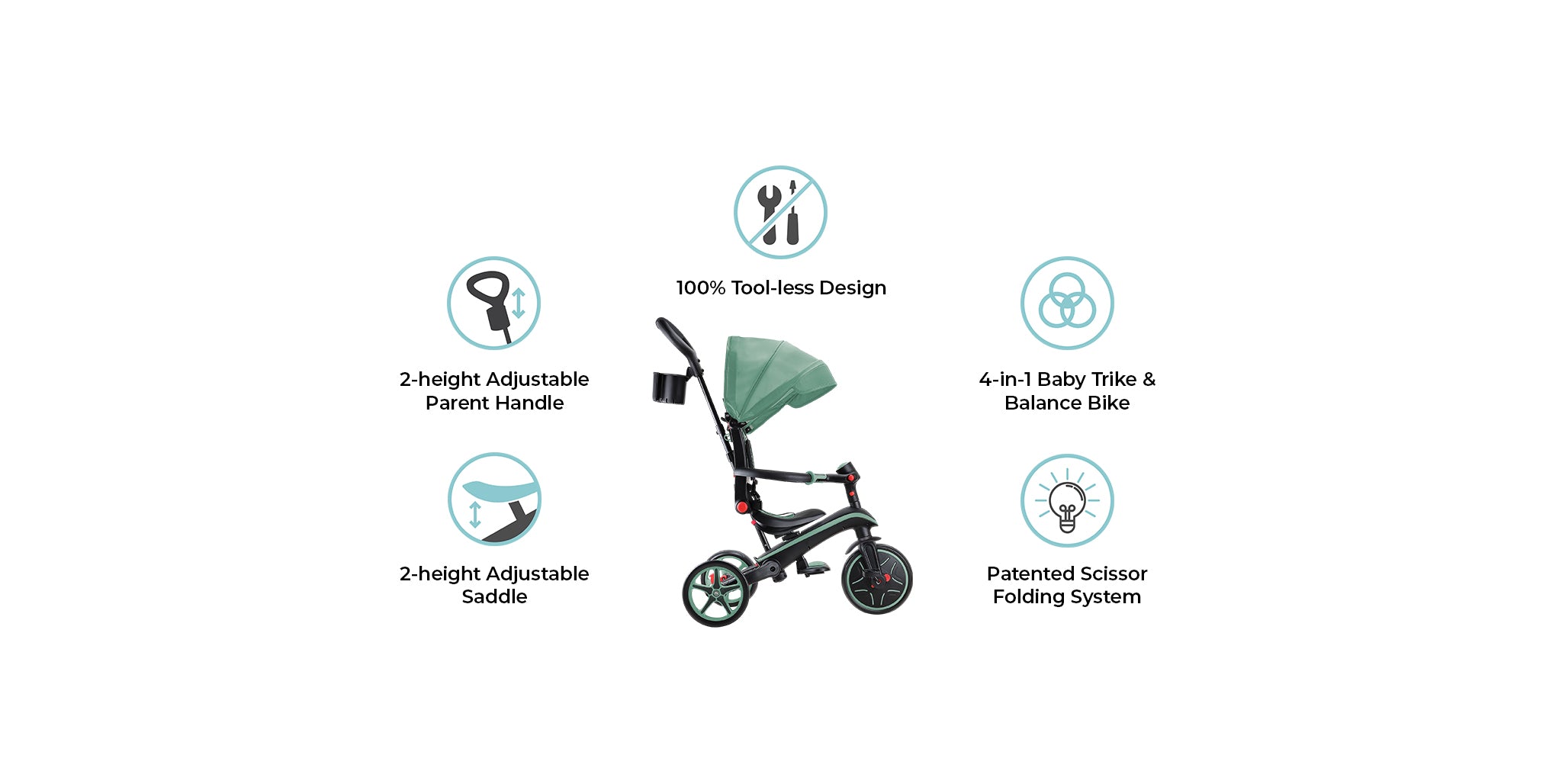 • 100% tool-less design allows you to easily switch between different modes without the need for any tools or screws—spring-loaded buttons seamlessly transform from folding trike to balance bike.